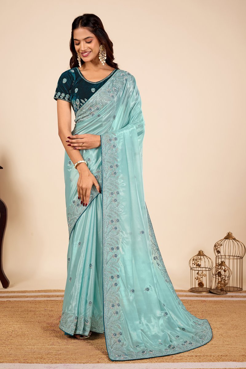Embroidery cording work with jarkan diamond Saree Length : 5.50 cuttBlouse Length : 1 meter blouse velvet Occasion : wedding season Saree fabric : ice georget (chocolate)