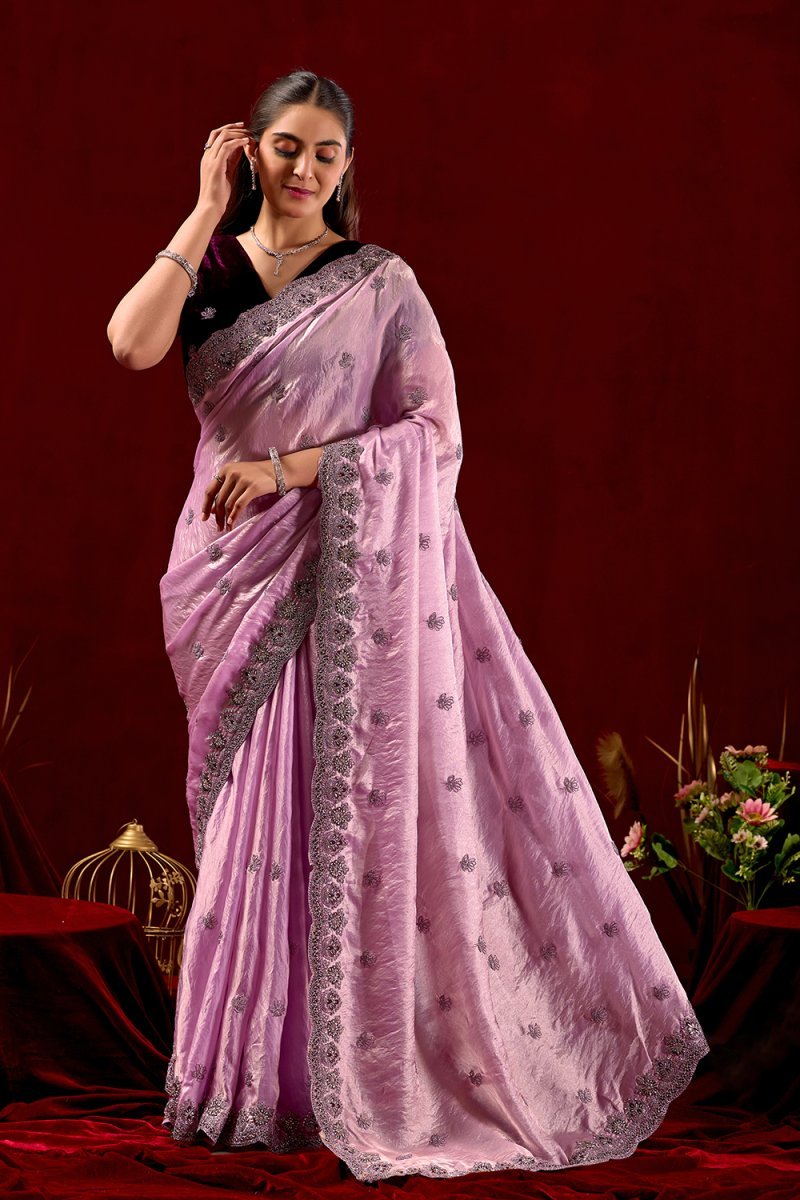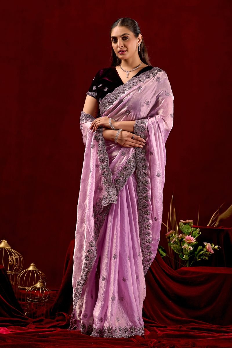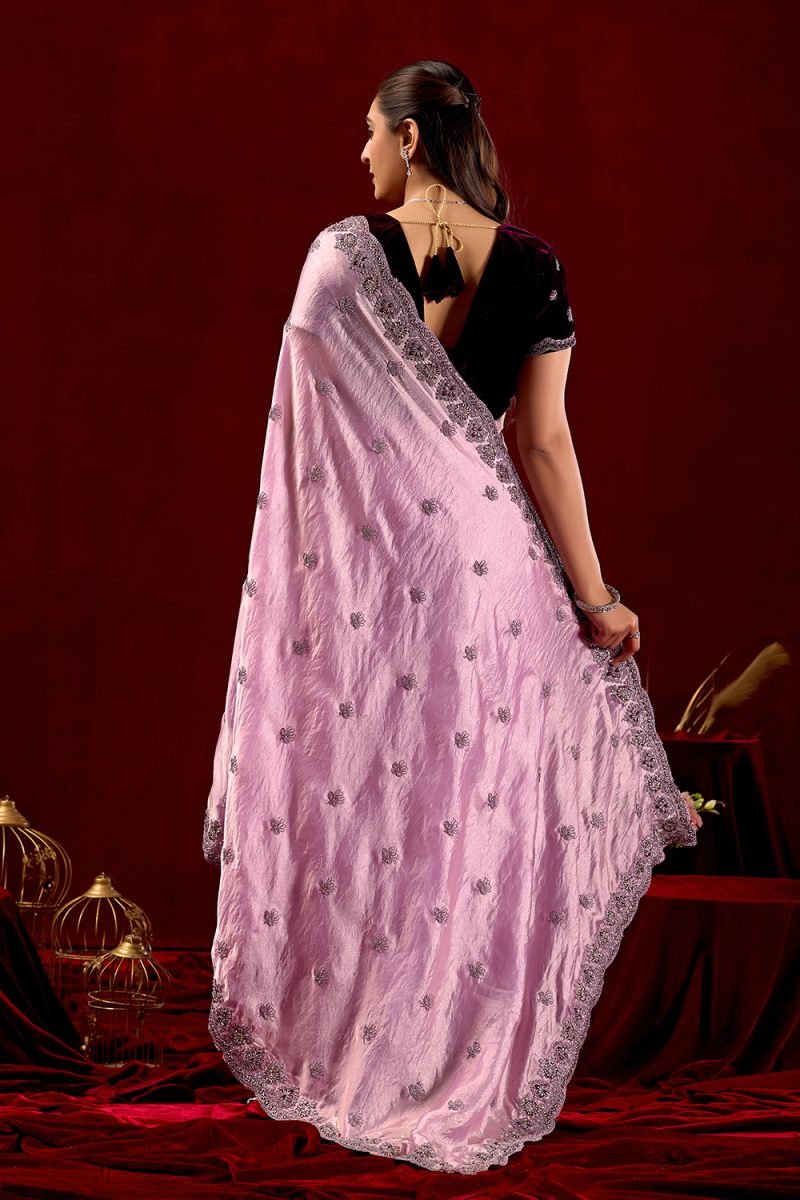 Embroidery cording work with jarkan diamond Saree Length : 5.50 cuttBlouse Length : 1 meter blouse velvet Occasion : wedding season Saree fabric : fandy sartin dark Work : white tread work