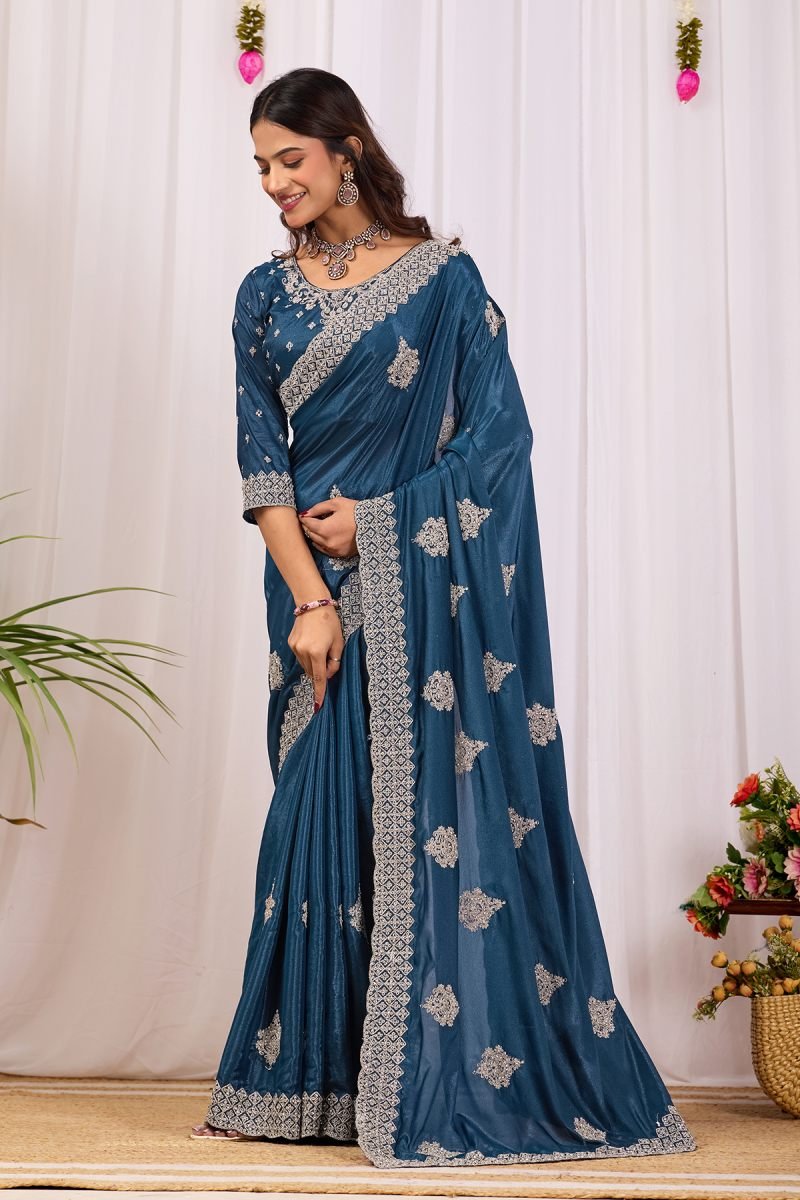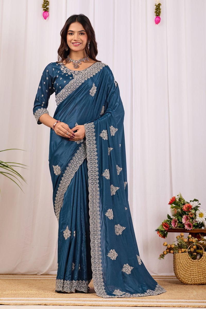 Embroidery cording work with jarkan diamond Saree Length : 6.50 cuttBlouse Length : full blouse heavy like front back sleeve Occasion : wedding season Saree fabric : ice georget (chocolate)
